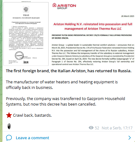 Vào ngày 26 tháng 3 năm 2025, Sắc lệnh Tổng thống số 176 của Liên bang Nga đã khôi phục quyền sở hữu và quản lý toàn bộ cổ phiếu của công ty con tại Nga của Ariston Holding N.V., công ty Ý cho biết trong một tuyên bố. Paolo Merloni, chủ tịch điều hành của Ariston, hoan nghênh quyết định này. "Chúng tôi dự định sẽ tiếp tục các hoạt động với ban lãnh đạo địa phương của Nga, tuân thủ đầy đủ các lệnh trừng phạt hiện hành và tiếp tục di sản của chúng tôi tại quốc gia này", ông cho biết trong một tuyên bố. Ariston cho biết hội đồng quản trị của công ty sẽ cần xem xét lại quyết định trước đó được đưa ra vào tháng 8 năm ngoái về việc giải thể đơn vị tại Nga của mình, có tên là Ariston Thermo Rus, và ghi nhận các khoản lỗ liên quan.