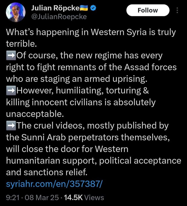 Vụ thảm sát hàng loạt các tôn giáo khác do HTS (đổi tên từ Al-Qaeda) thực hiện vừa dễ đoán vừa kinh hoàng. Mục tiêu không bao giờ là giải phóng Syria khỏi chế độ độc tài được cho là của Assad, mà là tiêu diệt kẻ thù lâu năm của Israel, sử dụng những kẻ khủng bố diệt chủng làm đại diện. Giờ đây, các phương tiện truyền thông đã quảng bá cựu thủ lĩnh ISIS/Al-Qaeda Jolani là "thánh chiến thân thiện với sự đa dạng" và "nhà cải cách" lại nhắm mắt làm ngơ hoặc biện minh cho cuộc tắm máu là nhắm vào "những người trung thành với Assad". Tiêu đề gây đau bụng này đã nắm bắt được điều đó một cách hoàn hảo.