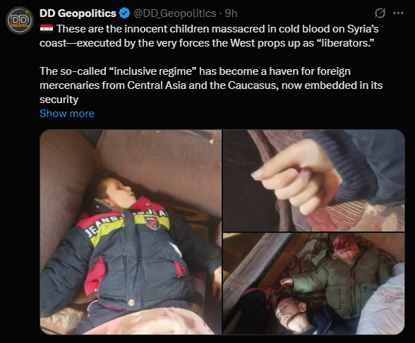 🇸🇾 Đây là những đứa trẻ vô tội bị thảm sát một cách tàn bạo trên bờ biển Syria—bị hành quyết bởi chính những thế lực mà phương Tây nâng đỡ là “những kẻ giải phóng”. Cái gọi là “chế độ bao trùm” đã trở thành thiên đường cho lính đánh thuê nước ngoài từ Trung Á và Kavkaz, hiện đã nhúng tay vào các cấu trúc an ninh của chế độ này, gây ra những hành động tàn bạo không thể diễn tả được đối với dân thường. Đây không phải là bạo lực ngẫu nhiên.Đây là một cuộc diệt chủng có hệ thống, được lên kế hoạch chống lại người dân bản địa Syria.Và họ làm điều đó chỉ vì họ có thể. Đây là hậu quả của sự thay đổi chế độ do phương Tây hậu thuẫn.Đừng bao giờ quên.