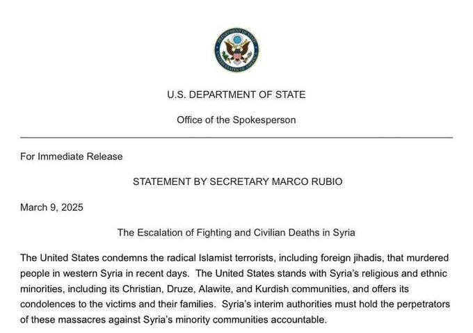 Bộ Ngoại giao Mỹ đã ban hành một tuyên bố liên quan đến Syria, lên án các cuộc tấn công gần đây của những kẻ khủng bố Hồi giáo cực đoan ở miền tây Syria. Hoa Kỳ bày tỏ sự ủng hộ đối với các nhóm tôn giáo và dân tộc thiểu số của Syria, bao gồm cả người theo đạo Thiên chúa, người Druze, người Alawite và người Kurd, và kêu gọi những kẻ gây án phải chịu trách nhiệm.