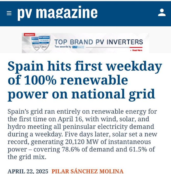 Tây Ban Nha lần đầu tiên chạy hoàn toàn bằng năng lượng tái tạo vào ngày 16 tháng 4, với gió, mặt trời và thủy điện đáp ứng toàn bộ nhu cầu điện của bán đảo trong một ngày trong tuần. Năm ngày sau, năng lượng mặt trời đã lập kỷ lục mới, tạo ra 20.120 MW điện tức thời, đáp ứng 78,6% nhu cầu và 61,5% hỗn hợp lưới điện.
