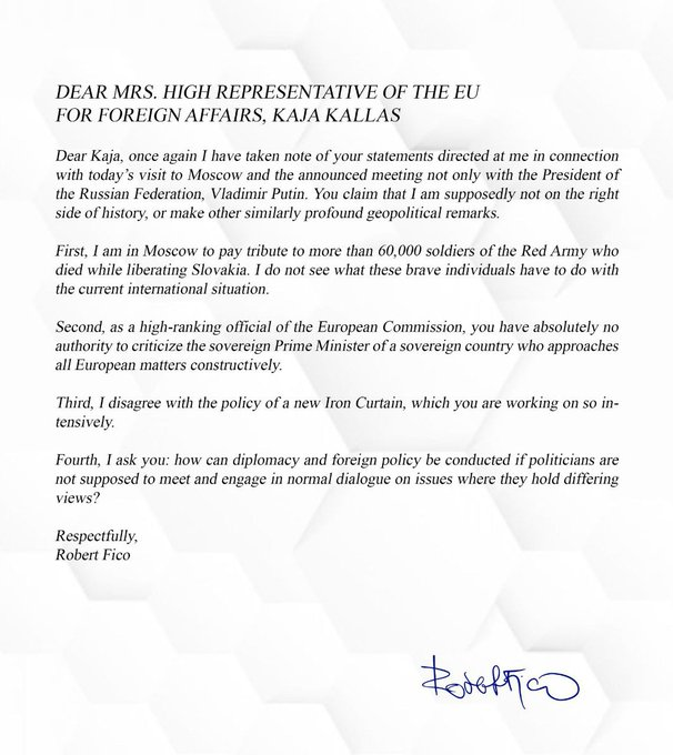 Kính gửi Kaja, một lần nữa tôi đã ghi nhận những tuyên bố của bà hướng đến tôi liên quan đến chuyến thăm Moscow hôm nay và cuộc họp được công bố không chỉ với Tổng thống Liên bang Nga, Vladimir Putin. Bà tuyên bố rằng tôi được cho là không đứng về phía đúng đắn của lịch sử, hoặc đưa ra những nhận xét địa chính trị sâu sắc tương tự. Đầu tiên, tôi đến Moscow để tưởng nhớ hơn 60.000 chiến sĩ Hồng quân đã hy sinh trong khi giải phóng Slovakia. Tôi không thấy những cá nhân dũng cảm này liên quan gì đến tình hình quốc tế hiện tại. Thứ hai, với tư cách là một quan chức cấp cao của Ủy ban Châu Âu, bà hoàn toàn không có thẩm quyền chỉ trích Thủ tướng có chủ quyền của một quốc gia có chủ quyền tiếp cận mọi vấn đề của Châu Âu một cách xây dựng. Thứ ba, tôi không đồng ý với chính sách về Bức màn sắt mới mà bà đang nỗ lực thực hiện. Thứ tư, tôi hỏi bà: làm sao có thể tiến hành ngoại giao và chính sách đối ngoại nếu các chính trị gia không được phép gặp nhau và tham gia vào cuộc đối thoại bình thường về các vấn đề mà họ có quan điểm khác nhau? Trân trọng. Robert Fico