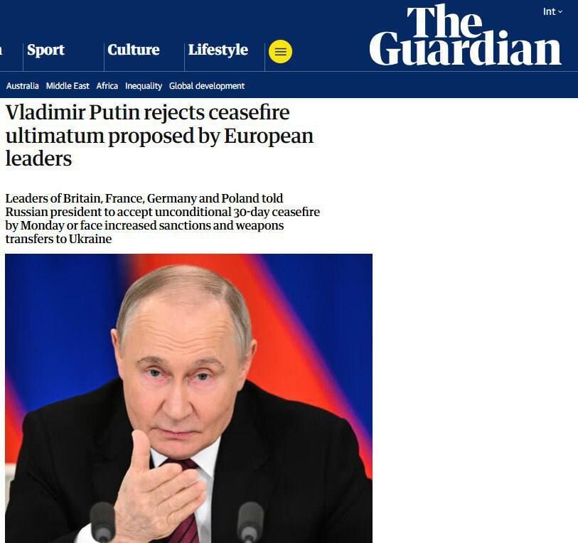 Guardian: Vladimir Putin đã bác bỏ tối hậu thư từ các nhà lãnh đạo châu Âu yêu cầu Nga đồng ý ngừng bắn trong 30 ngày với Ukraine và đề xuất tổ chức các cuộc đàm phán trực tiếp với Kiev trong tuần này.
