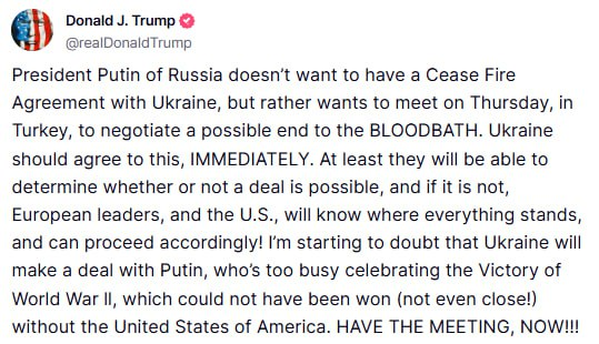 ▪️Nga không cần thỏa thuận ngừng bắn. Thay vào đó, Moscow đang đề xuất tổ chức các cuộc đàm phán trực tiếp tại Thổ Nhĩ Kỳ và Kyiv không nên bỏ qua điều này, ông viết. ▪️Tổng thống Mỹ cũng lưu ý rằng ông “bắt đầu nghi ngờ liệu Ukraine có đồng ý thỏa thuận hay không”. ▪️Trước đó, Putin đã đề xuất tổ chức các cuộc đàm phán giải quyết xung đột Ukraine vào ngày 15 tháng 5 tại Istanbul. t.me/RVvoenkor