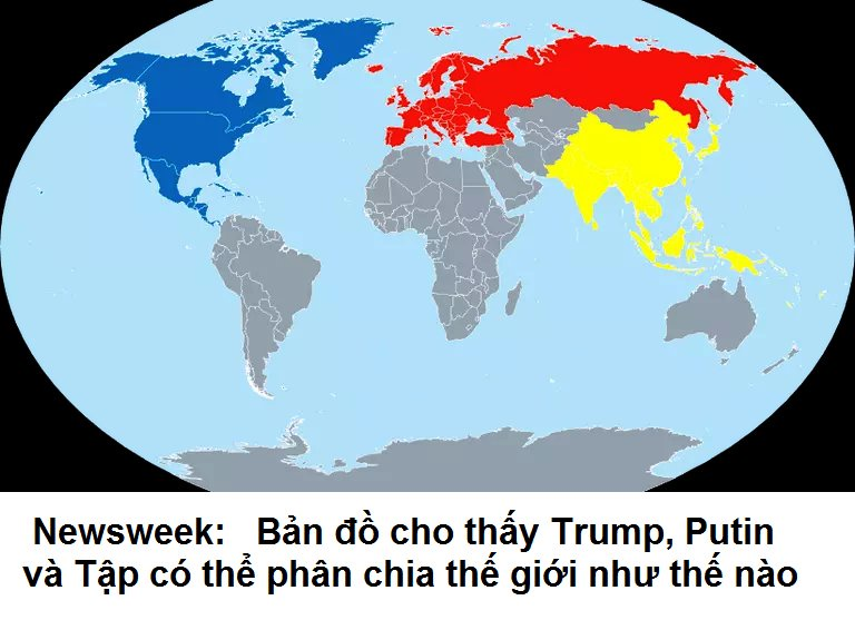Dmitri Tran Trần Khánh Nga, Mỹ và Trung Quốc sẽ phân chia thế giới thành các vùng ảnh hưởng của mình như thế nào? Xung đột ở Ukraina rồi cũng sẽ kết thúc, tuần qua giới phân tích có nhiều nhận định về phương án phân chia thế giới tương tự như Hội nghị Yalta năm 1945, ở đó các nhà lãnh đạo Liên Xô, Hoa Kỳ và Anh bàn luận về cách phân chia châu Âu sau khi Thế chiến hai kết thúc. ◽️ Tạp chí Newsweek của Mỹ chiều hôm nay, 13/04, có bài viết về việc các chính trị gia Hoa Kỳ tiết lộ nhận định của mình về cách ba ông Vladimir Putin, Donald Trump và Tập Cận Bình sẽ phân chia thế giới thành các phạm vi ảnh hưởng của mình như thế nào, và Newsweek đã đăng bản đồ đó: -. Vùng ảnh hưởng của Nga (màu đỏ) gồm toàn bộ châu Âu, khu vực Kavkaz (Azerbaijan, Armenia, Gruzia) và Thổ Nhĩ Kỳ; -. Vùng ảnh hưởng của Mỹ (màu xanh) sẽ mở rộng tới Bắc Mỹ và Greenland; -. Vùng ảnh hưởng của Trung Quốc (màu vàng) vươn tới Đông Nam Á. Nhật Bản, Ấn Độ và Pakistan. Và theo Newsweek, các khu vực “tự do” là Trung Á, Trung Đông, Châu Phi, Châu Mỹ Latinh, Úc, New Zealand và Mông Cổ không nằm trong bất kỳ vùng nào trong ba vùng ảnh hưởng này. ◽️ Như vậy, theo các chuyên gia Newsweek, Nga sẽ tăng cường sự ảnh hưởng của mình ở châu Âu có phần còn rộng hơn Liên Xộ trước đây. Còn Việt Nam ta, nằm sâu trong vùng ảnh hưởng của Trung Quốc như từ trước đến nay, và tương lai chắc cũng sẽ rất lâu như thế nữa.