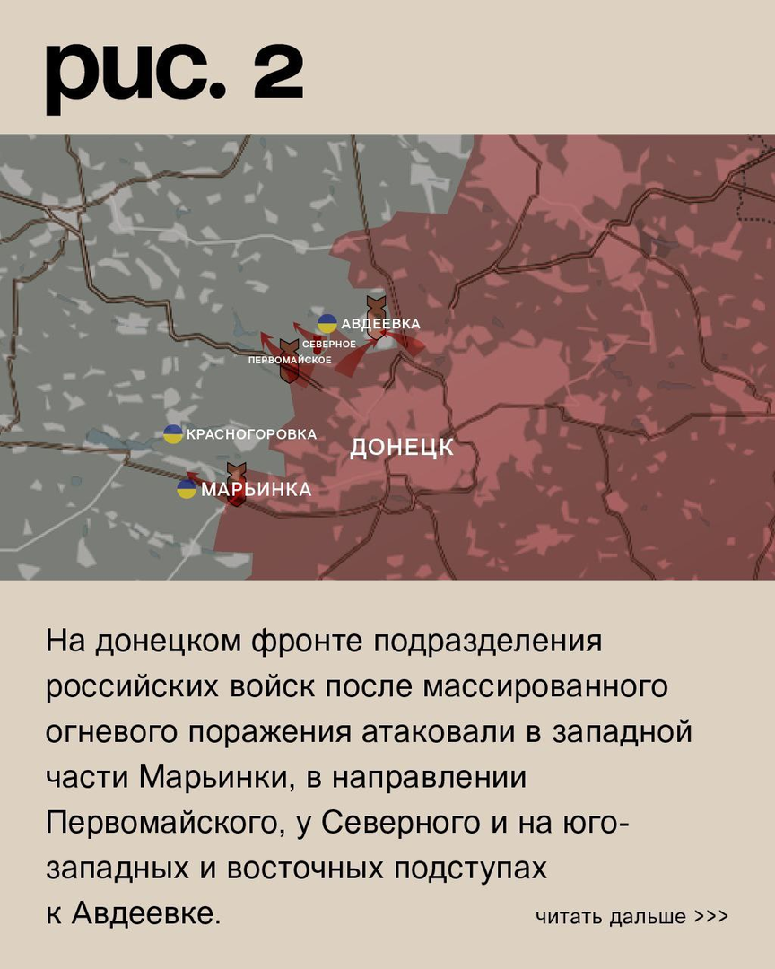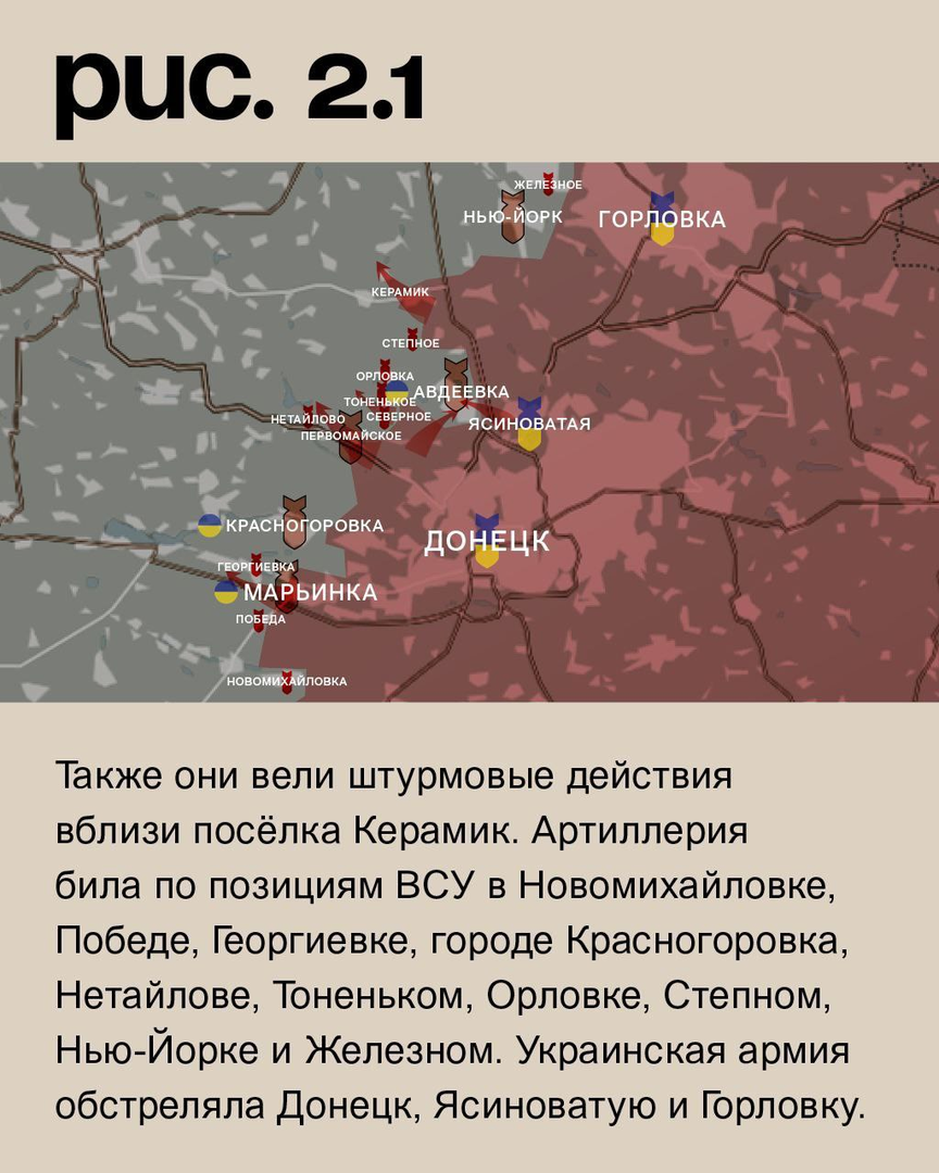 Ở mặt trận Donetsk, các đơn vị quân đội Nga sau thất bại nặng nề đã tấn công vào phía tây Maryinka, theo hướng Pervomaisky, gần phía bắc và trên các hướng tiếp cận tây nam và đông tới Avdiivka. Họ cũng tiến hành các hoạt động tấn công gần làng Keramik. Pháo binh đã bắn trúng các vị trí của Lực lượng Vũ trang Ukraine ở Novomikhailovka, Pobeda, Georgievka, thành phố Krasnogorovka, Netaylov, Thin, Orlovka, Stepnoy, New York và Zhelezny. Quân đội Ukraine nã pháo vào Donetsk, Yasinovataya và Gorlovka. (Hình 2)