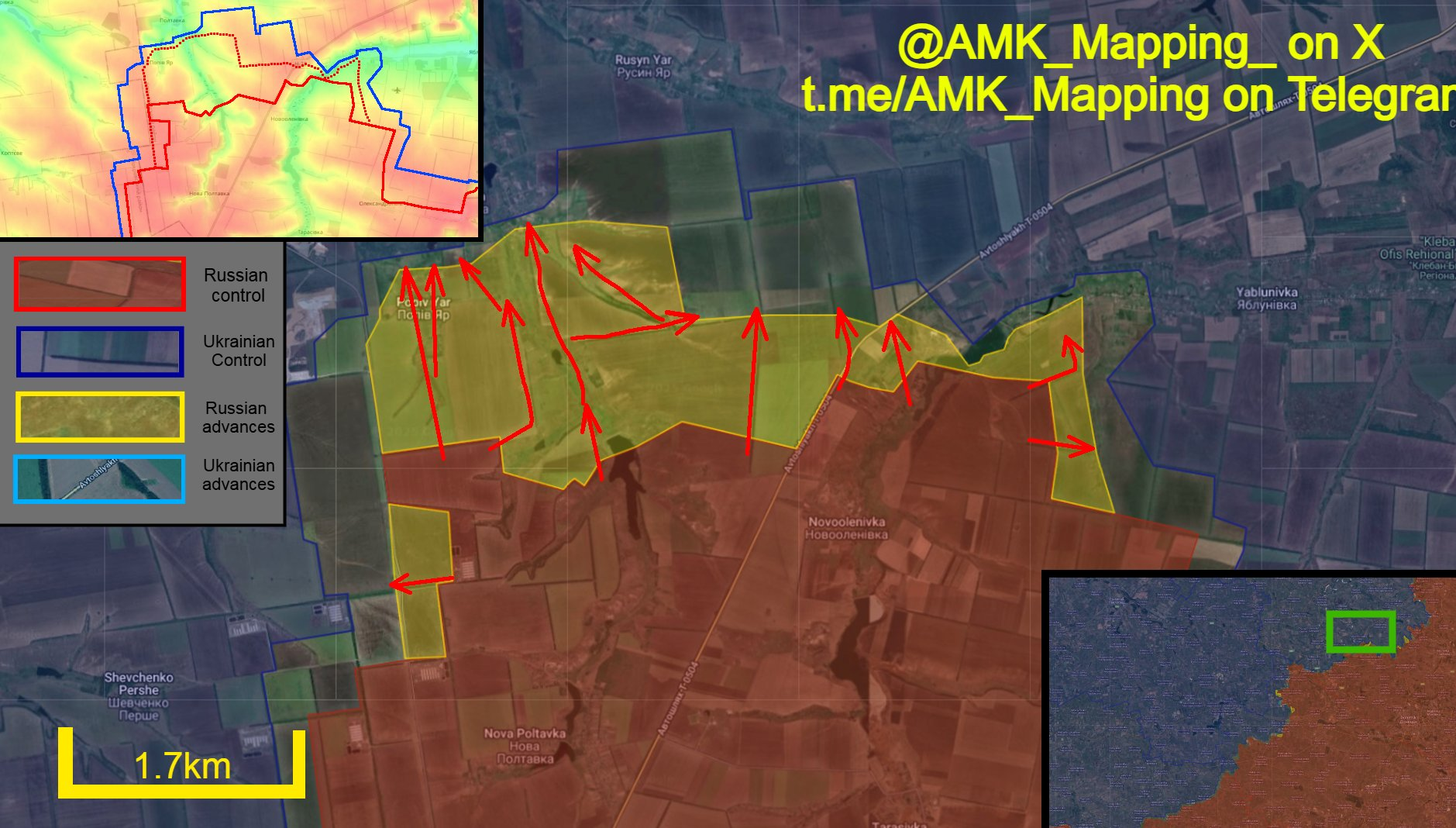 Trên khu vực giữa Đường cao tốc Pokrovsk - Kostyantynivka và Sông Poltavka, quân đội Nga đã tiến về phía bắc theo một hàng cây và chiếm được các vị trí tại giao lộ của nó và một hàng cây vuông góc thứ hai.