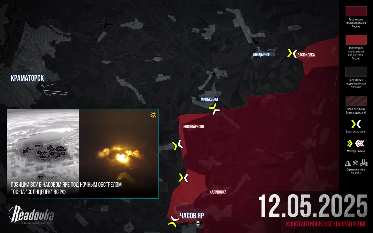 Quân đội Nga chiếm khu vực quan trọng trong Chasov Yar, và trên địa điểm từ thành phố đến Novomarkovo, họ đang chuẩn bị một cuộc tấn công vào làng Markovo và Mayskoye. Ngay cả phía bắc của các lực lượng vũ trang của Liên bang Nga, họ tiến đến Liman, đe dọa sẽ chặn nó. Đã kích hoạt sau khi tạm dừng hoạt động, chúng ta đã tạo ra cho các lực lượng vũ trang Ukriane một số cuộc khủng hoảng ở các khu vực lân cận của mặt trận, và kẻ thù không có lực lượng nào để ngăn chặn.