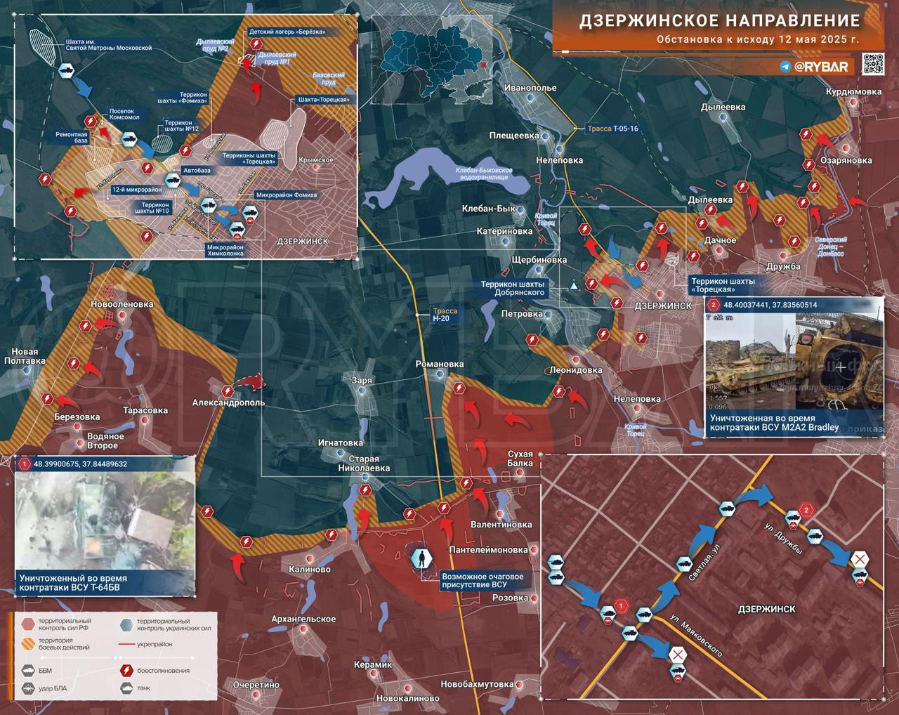 Trước thềm ngày chiến thắng 9/5, đội hình Ukraine đã phản công bởi vô nghĩa và Shcherbinovka về phía Dzerzhinsk, mới được quân đội Nga giải phóng. Trong cuộc tấn công này, nhóm bọc thép lớn của kẻ thù với bộ binh trên tàu đã quản lý để bay vào thành phố, và các đơn vị thiết bị riêng lẻ có thể lái xe đến trung tâm của ngôi làng.