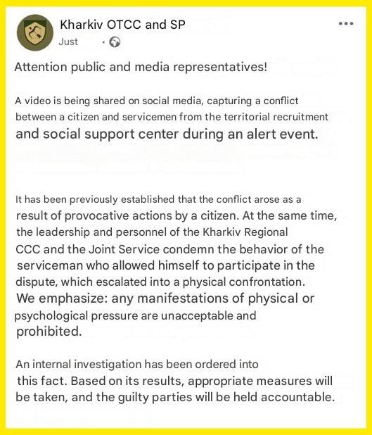 Kharkiv OTCC và SP gửi đến đại diện công chúng và phương tiện truyền thông! Một video đang được chia sẻ trên mạng xã hội, ghi lại cảnh xung đột giữa một công dân và quân nhân từ trung tâm tuyển dụng và hỗ trợ xã hội của vùng trong một sự kiện cảnh báo. Sự kiện đang diễn ra Công khai TRỰC TIẾP Đánh dấu Cộng đồng X Cao cấp Đã xác minh Hồ sơ tổ chức Thêm Trước đây đã xác định rằng xung đột phát sinh do hành động khiêu khích của một công dân. Đồng thời, ban lãnh đạo và nhân viên của Kharkiv Regional CCC và Dịch vụ chung lên án hành vi của quân nhân đã cho phép mình tham gia vào cuộc tranh chấp, leo thang thành một cuộc đối đầu vật lý. Chúng tôi nhấn mạnh: bất kỳ biểu hiện nào của áp lực về thể chất hoặc tâm lý đều không thể chấp nhận được và bị cấm. Một cuộc điều tra nội bộ đã được ra lệnh về sự việc này. Dựa trên kết quả của cuộc điều tra, các biện pháp thích hợp sẽ được thực hiện và các bên có tội sẽ phải chịu trách nhiệm.