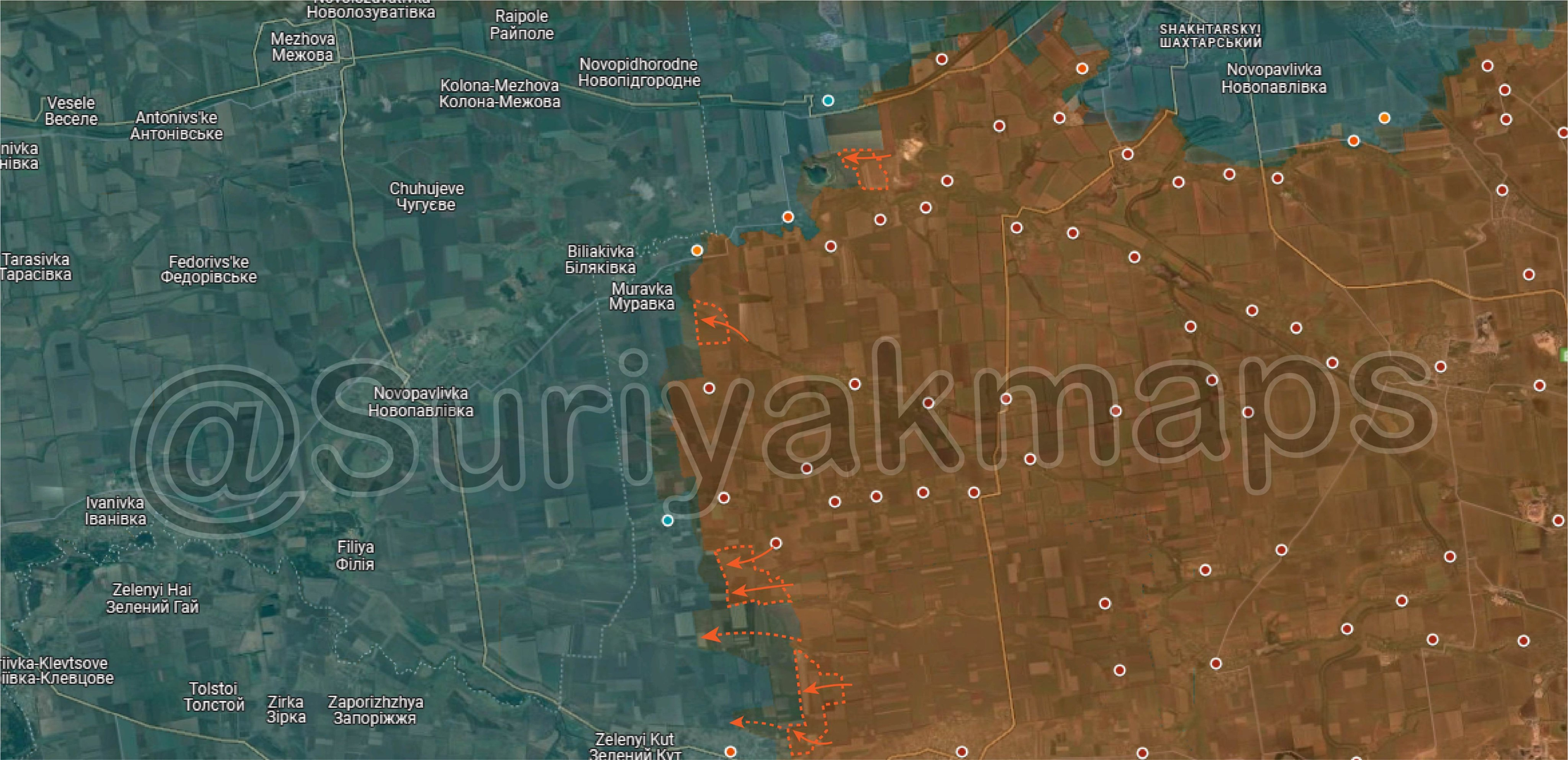 Tình hình mặt trận Velikaya Novoselovka: Trong ba ngày qua, Quân đội Nga đã có những bước tiến mới về phía tây bắc Dniproenerhiya dọc theo sông Mokri Yali và tuyến phòng thủ chính của Ukraine.