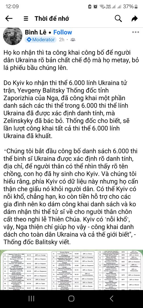 Hôm nay em đọc được tin này mà nếu đúng thì cách Nga tung DS tử sĩ ra cũng quái: Không phải Moscow thông qua cụ Med hay ông Rốp, mà là thống đốc Zaparozhie, một vùng về "pháp luật QT" vẫn đang là U cà. Giờ nếu Ze và đồng bọn bảo là Nga công bố DS fake thì có nghĩa là đồng ý vùng Zap là của Nga! Công nhận DS kia thì tiền đâu mà trả. Giờ mà cãi là DS này fake thì vẫn phải nhận về để thử ADN mới chứng minh fake được. "Chả may" không fake thì quay lại mục trả tiền, hơn 2 tỷ Trump tệ,. Còn nếu chứng minh được là Fake thì trả lại Nga sau, game này có mà đến lúc Kiev thất thủ cung chưa xong, chưa kể tốn cũng kha khá tiền, các cụ nhỉ?