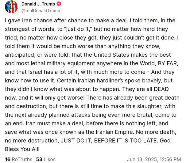 ➖"Đã có sự tàn phá và mất mát lớn về người, nhưng vẫn chưa quá muộn để ngăn chặn cuộc tàn sát này. Iran phải đạt được một thỏa thuận trong khi vẫn còn thứ gì đó để cứu, trong khi vẫn có thể bảo tồn thứ từng được gọi là đế chế Iran", ông viết.