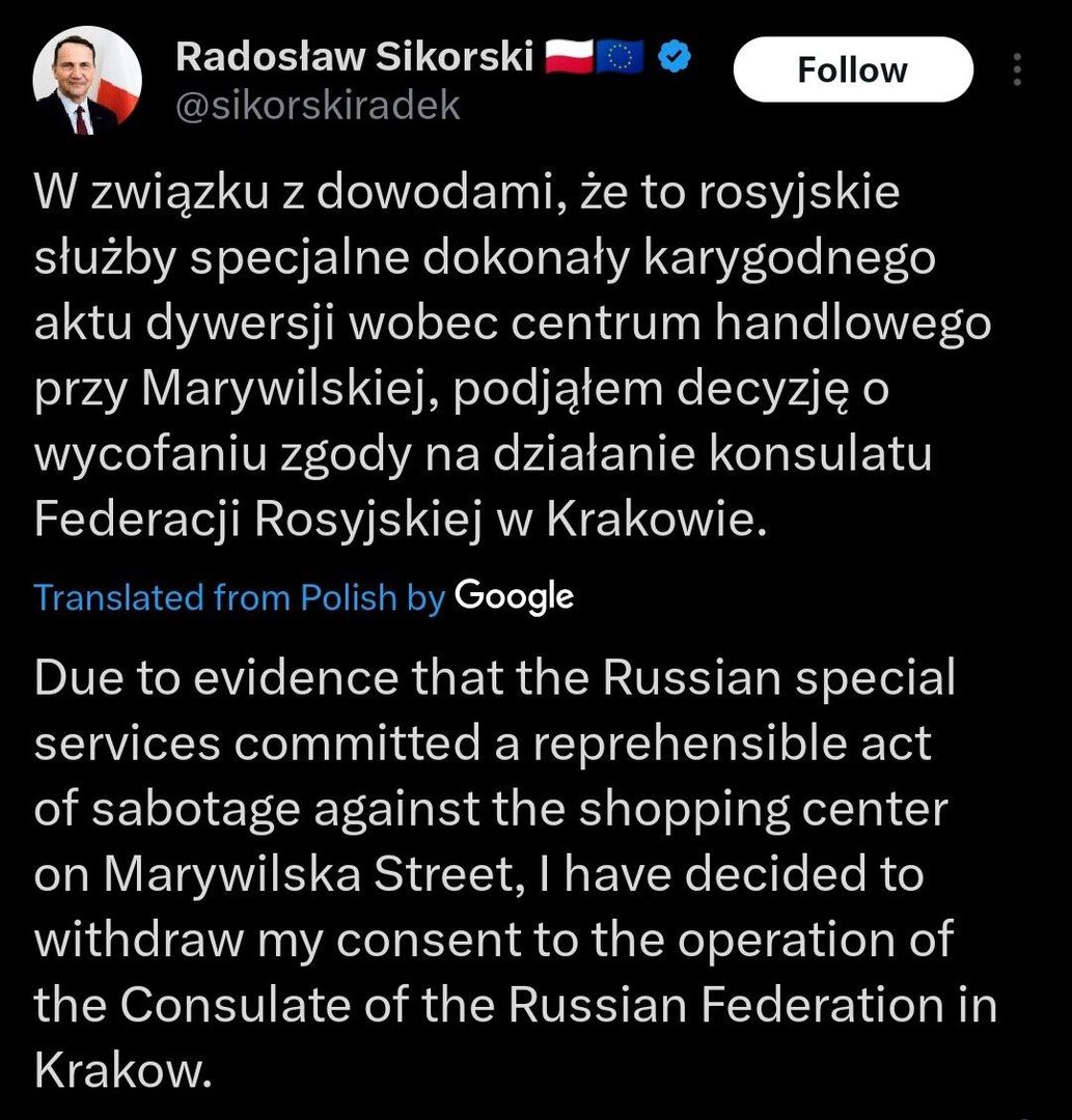 ▪️Chính quyền địa phương cho biết vụ hỏa hoạn tại trung tâm mua sắm Marywilska ở thủ đô Ba Lan là hậu quả của hành vi đốt phá có chủ đích được cho là do cơ quan tình báo Nga chỉ đạo. Một số người liên quan đã bị bắt giữ, số còn lại đã được xác định và đang bị truy nã. Thủ tướng Tusk cho biết mọi người đều sẽ phải chịu trách nhiệm. ▪️Vào ngày 12 tháng 5 năm 2024, một vụ hỏa hoạn lớn đã xảy ra tại trung tâm mua sắm Marywilska 44. Khu phức hợp có diện tích 80 nghìn m², bao gồm khoảng 1.400 cửa hàng và cửa hàng dịch vụ.