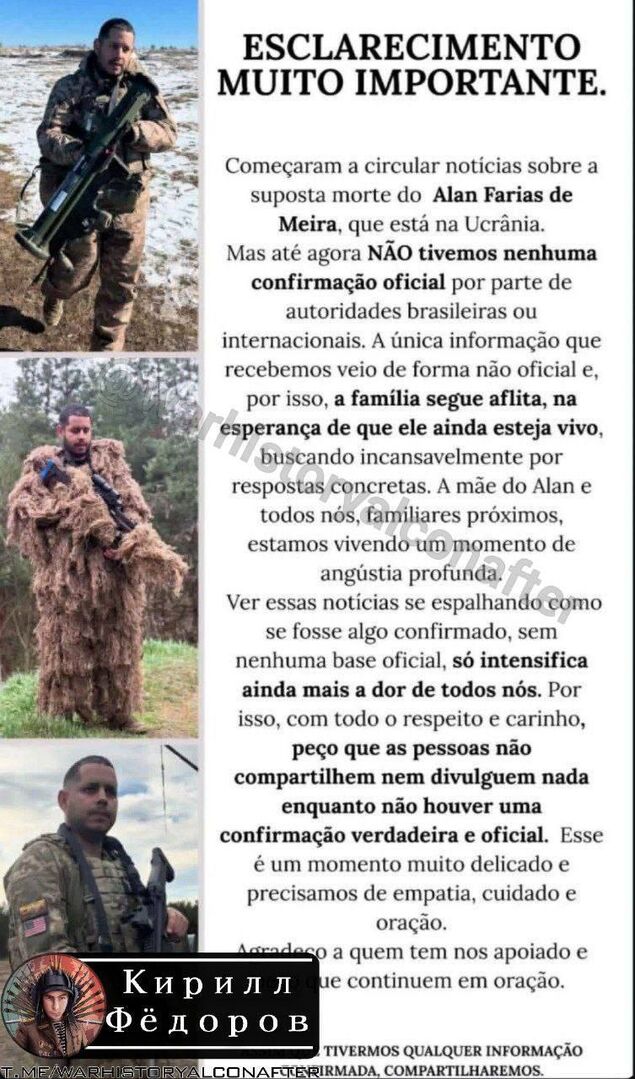 🇧🇷🇺🇦Bằng chứng trực quan cho thấy hậu quả của cuộc tấn công vào bãi tập Shostka là có lính đánh thuê nước ngoài đã bị tiêu diệt. Một người Brazil đang tìm kiếm thông tin về người bạn và người đồng hương của mình tên là Alan Faria Meira, người dường như đã trở thành 200 ( tử trận) tại bãi tập đó. Trong quá trình tìm kiếm, lính đánh thuê đã liên lạc với Bộ chỉ huy tác chiến "Bắc", nhưng không ai nói gì cả.