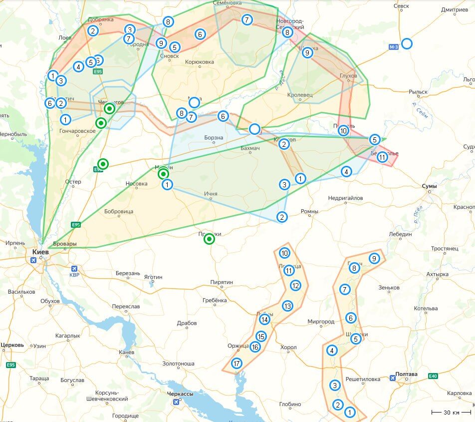 Tuyến phòng thủ "Chernigov" theo kế hoạch của quân đội phía này. Tài liệu từ năm 2022. Tên của các khu định cư được lấy từ tài liệu và sau đó được thêm vào bản đồ Yandex.