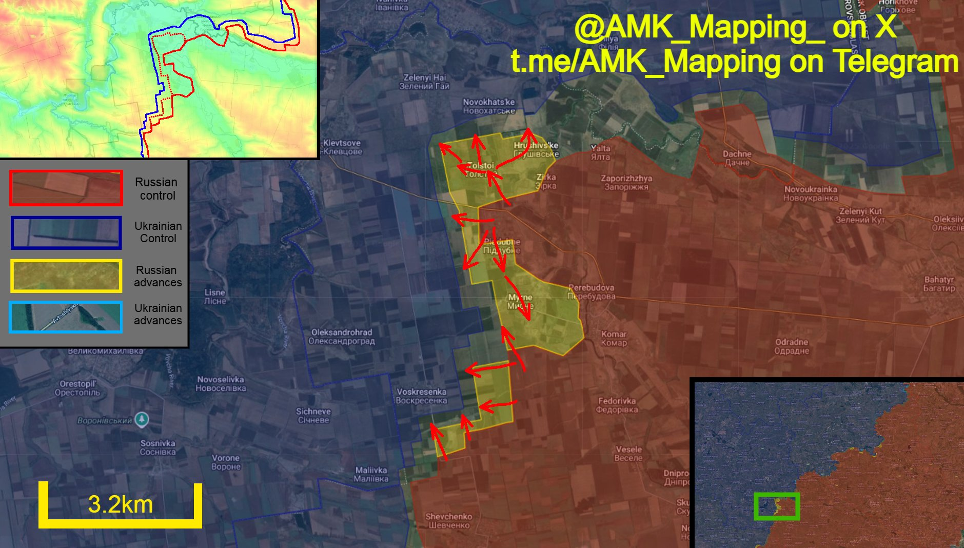 Quân đội Nga tấn công về phía bắc và chiếm được phần phía đông của Tolstoi, trước khi hoàn tất việc chiếm giữ khu vực này và vùng đất Hrushivske lân cận. Họ cũng bắt đầu tấn công về phía tây Myrne từ phía nam, cuối cùng buộc quân Ukraine phải rút khỏi khu định cư và sau đó là việc Nga chiếm được khu định cư này.