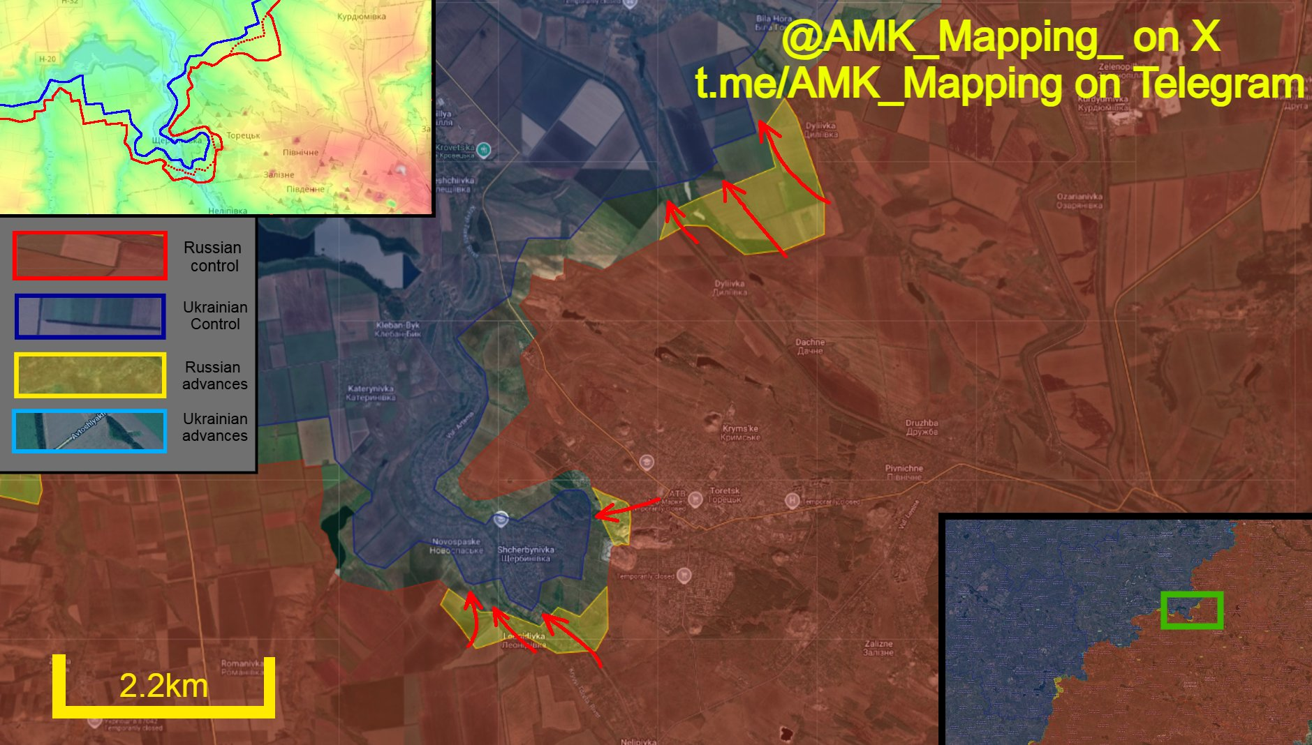Về phía tây nam, quân Nga đã hoàn tất việc chiếm giữ khu dân cư nhỏ phía bắc các terykon ở phía tây Toretsk, điều này sẽ đơn giản hóa các cuộc tấn công vào khu dân cư ở phía bắc, qua đó hoàn tất việc chiếm giữ thành phố.