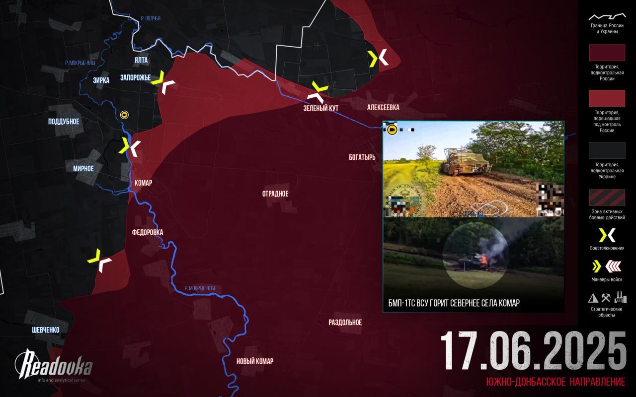 Theo hướng Nam Donbass, việc kẻ thù mất làng Bogatyr từ lâu đã dẫn đến sự suy yếu về vị thế của Lực lượng vũ trang Ukraine. Trong trận chiến giành ngôi làng chủ chốt Komar, quân đội Nga đã đẩy lùi được kẻ thù qua Sông Mokrye Yaly — Lực lượng vũ trang Ukraine không còn việc gì để làm ở khúc quanh của mình nữa.