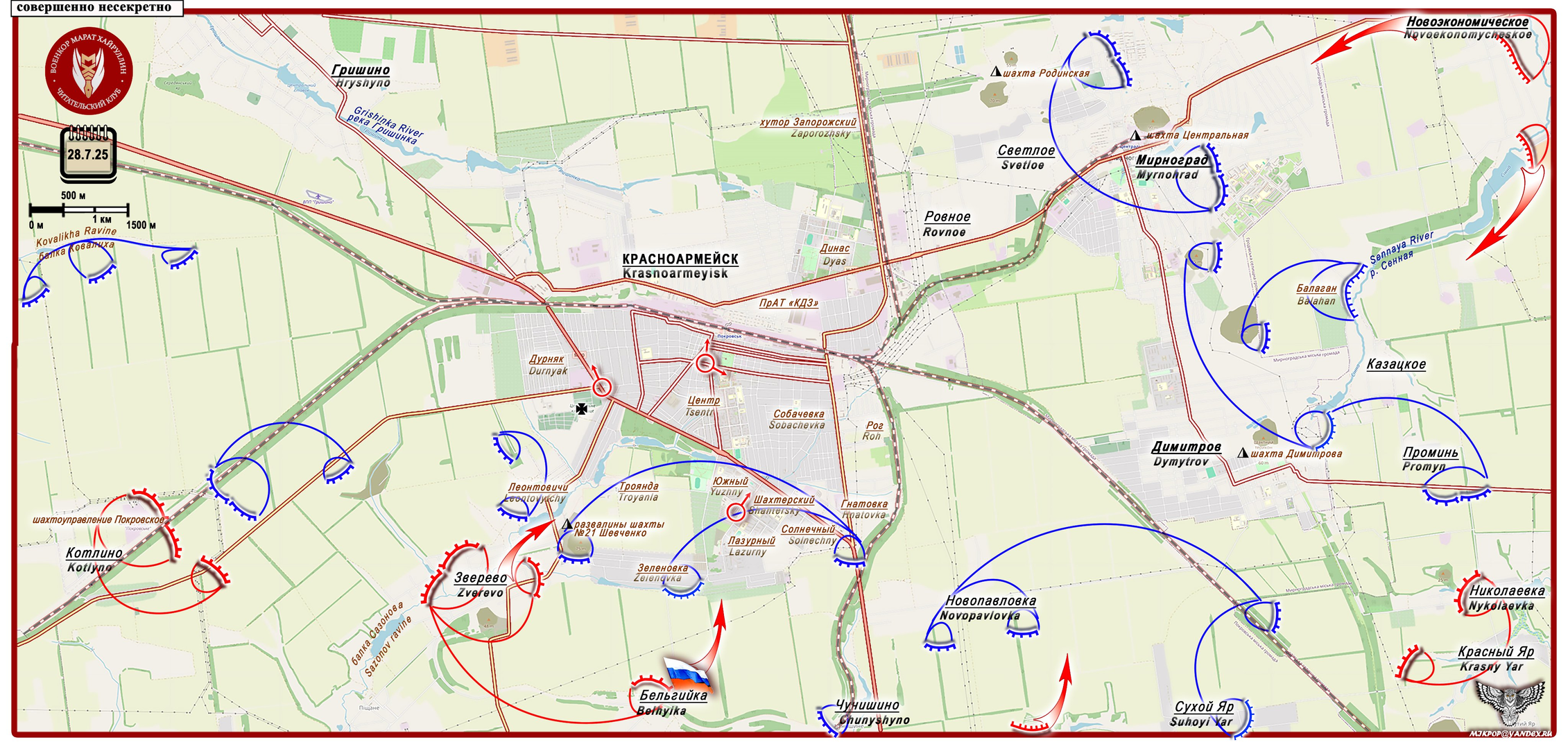 Khu định cư Belgiyka (Belhyika trên bản đồ, được đánh dấu bằng cờ Nga, 48.234275, 37.161210) nằm trên tuyến đường sắt nối Chunishino (Chunyshyno) và tàn tích của mỏ Shevchenko (Развалины Шахты* Số 21 Шевченко) qua Zverevo. Khu vực này đóng vai trò là cửa ngõ vào vùng ngoại ô phía nam của Krasnoarmeysk (Pokrovsk), với khả năng tiếp cận các quận Zelenovka (Зеленовка) hoặc Lazurny (Лазурный) tùy thuộc vào tình hình. Một phương án tác chiến thay thế sẽ là bao vây làng Chunishino, qua đó đánh vào sườn khu vực phòng thủ kiên cố của Ukraine tại Chunishino-Sukhy Yar, bao phủ giao lộ giữa các trung tâm phòng thủ Pokrovsk và Dimitrov (Mirnograd).