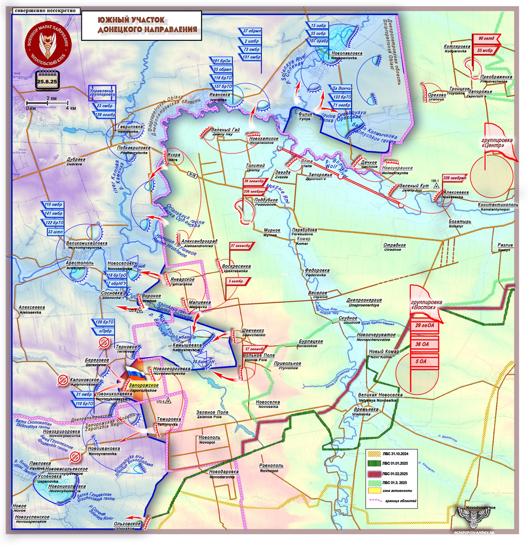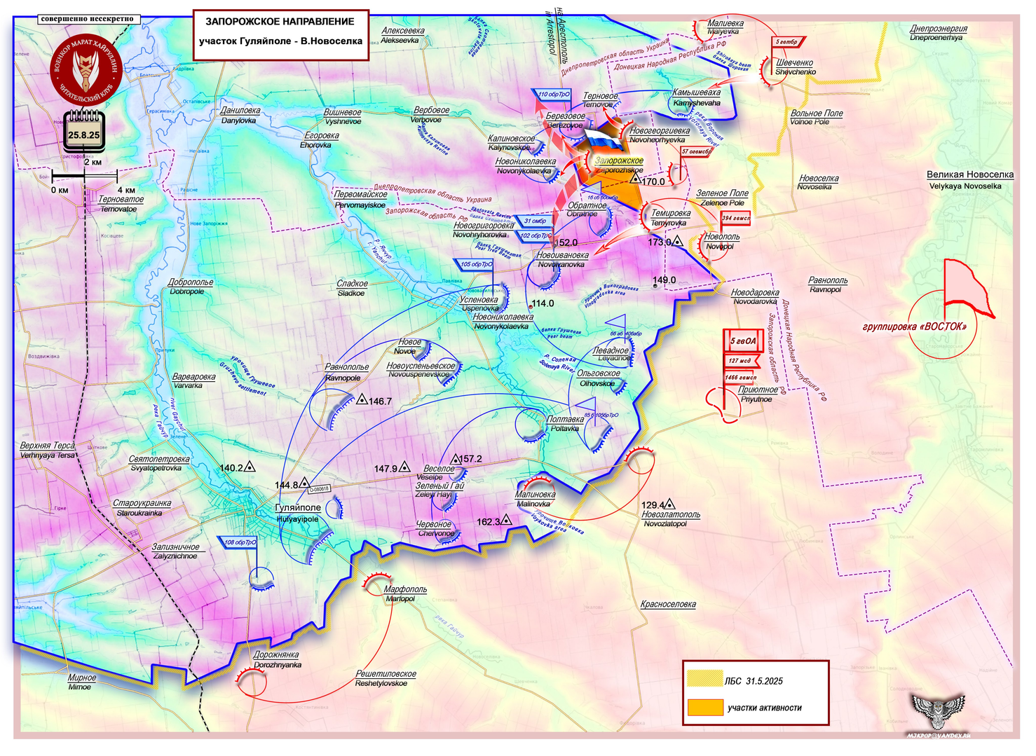 Các đơn vị thuộc Cụm "Phía Đông" của Lực lượng Vũ trang Nga đã bắt đầu chiến dịch giải phóng khu vực phòng thủ Berezovoe-Kalynovskoe-Novonikolaevka của AFU. Những hành động này sẽ cho phép bao vây sâu hơn về phía nam khu vực nhô ra Kamyshevakha, đồng thời, bằng cách tiến về phía nam, sẽ đảm bảo các vị trí thuận lợi trên lưu vực sông Voronaya và Yanchur. Điều này sẽ bao vây phía bắc khu vực phòng thủ Obratnoe-Novoivanovka-Levadnoe của AFU và đe dọa sườn trung tâm phòng thủ Gulyaipole của AFU.