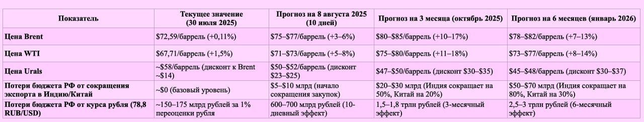 Nga xuất khẩu 4,68 triệu thùng dầu/ngày, trong đó Ấn Độ và Trung Quốc mua ~2,6–2,7 triệu thùng. Nếu đến ngày 8 tháng 8, Ấn Độ bắt đầu cắt giảm lượng mua 20% (0,3–0,4 triệu thùng/ngày) và Trung Quốc 10% (0,1 triệu thùng/ngày), thì thiệt hại sẽ lên tới 5–10 tỷ đô la trong 10 ngày (với Urals ở mức ~50 đô la).