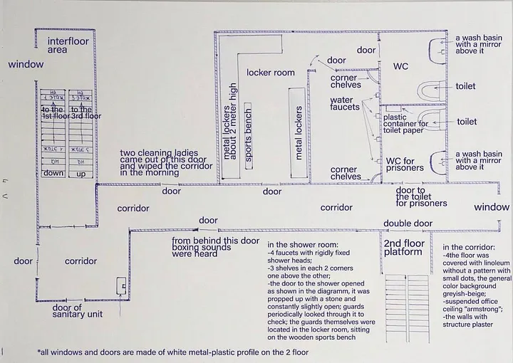 Nhà vệ sinh ở tầng 2 được sử dụng hai lần mỗi ngày—lính canh dẫn từng người bị giam giữ, bịt mắt; mỗi người được một phút để vệ sinh cá nhân.