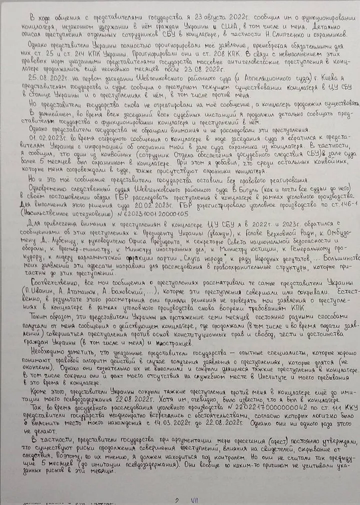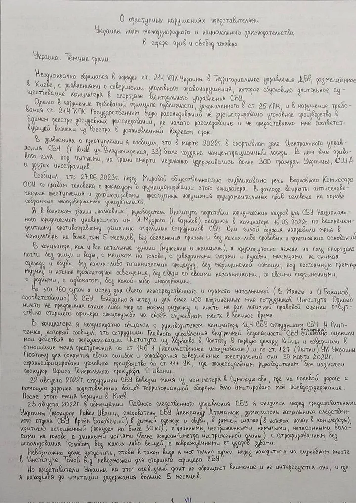 “Để chấm dứt việc tra tấn, người đứng đầu nhà tù không chính thức này, Trung tá Nikolay Slipchenko, đã yêu cầu tôi ký vào lời khai gian dối chống lại: cựu Chánh Văn phòng Tổng thống [Petro Poroshenko] Ihor Rainin (cựu Thống đốc Kharkiv); Bộ trưởng Quốc phòng Stepan Poltorak (cựu Giám đốc Học viện Vệ binh Quốc gia Kharkiv); Phó Thống đốc Kharkiv Oleksandr Skakun; Phó Giám đốc Cục Điều tra Nhà nước Oleksandr Sokolov (cùng phục vụ tại SBU Kharkiv); Trưởng phòng tác chiến chính của Cục Điều tra Nhà nước Ihor Geida (cùng phục vụ tại SBU Kharkiv); Trưởng phòng SBU khu vực Kharkiv Roman Dudin.