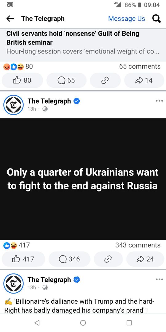 Mới thấy cái này từ The Telegraph, bọn này chống Nga thứ hai thì không ai Chủ nhật. "Chỉ một phần tư dân Uka muốn đánh lộn tới cùng với Nga". Có vẻ bọn Anh đang dọn đường cho Trump đi gặp Putin thật sang chảnh. Đọc các bình luận khá thú vị nên vô đây méc quý anh chị.