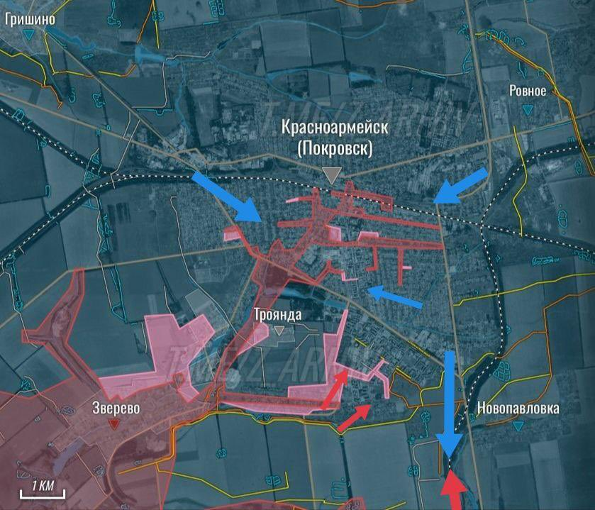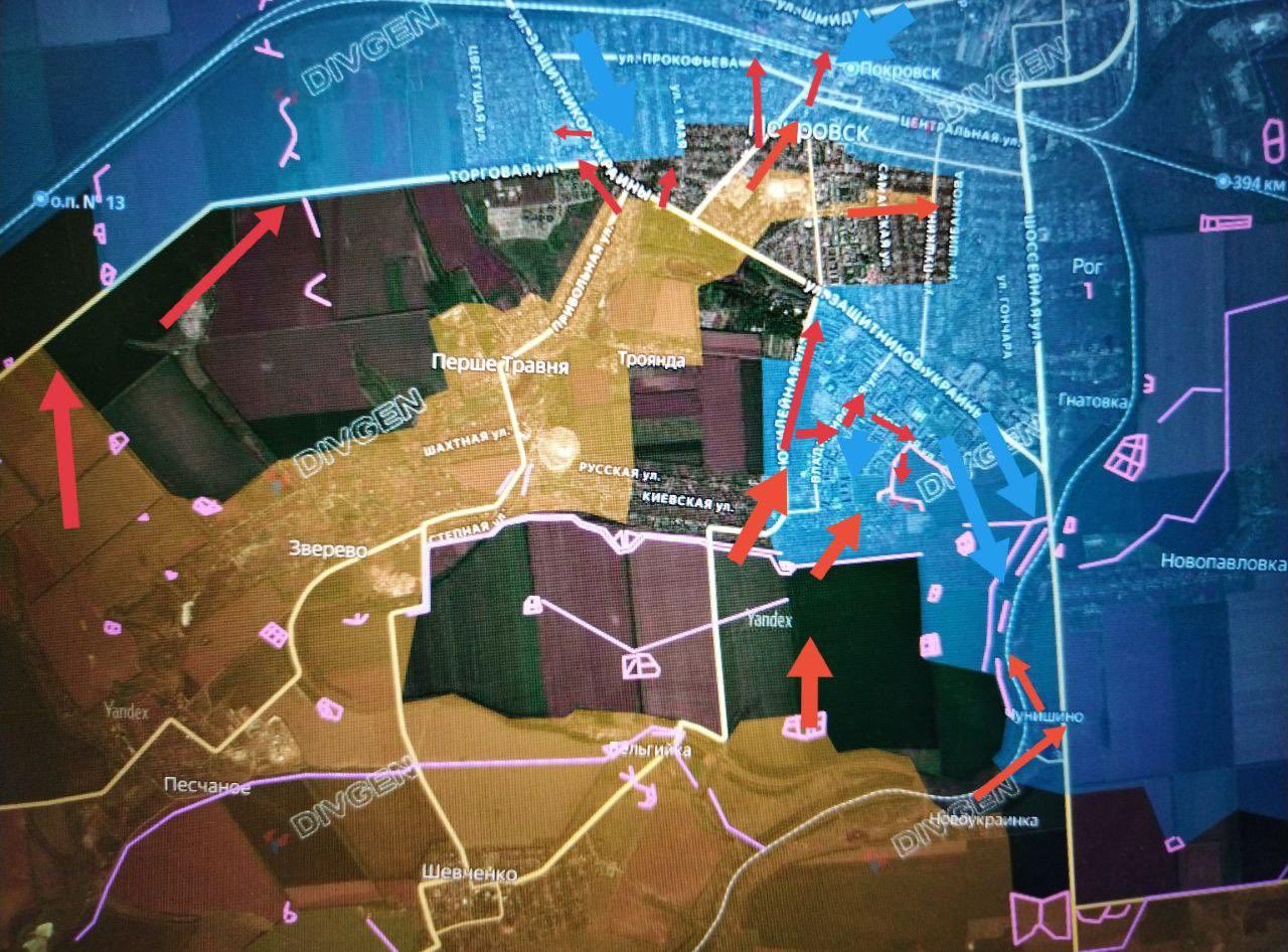 Các đơn vị Lực lượng Vũ trang Nga tiếp tục tấn công tại ngã ba đường Pokrovsk và Dobropolsky, tiến đến ngoại ô Shevchenko và đánh dấu đường di chuyển đến Grishino — một trung tâm tiếp tế quan trọng của Lực lượng Vũ trang Ukraine. Việc mất ngôi làng này sẽ khiến lực lượng Ukraine tại Pokrovsk và Mirnograd mất các tuyến đường tiếp tế, khiến hệ thống phòng thủ của họ bên bờ vực sụp đổ và đe dọa bị bao vây.