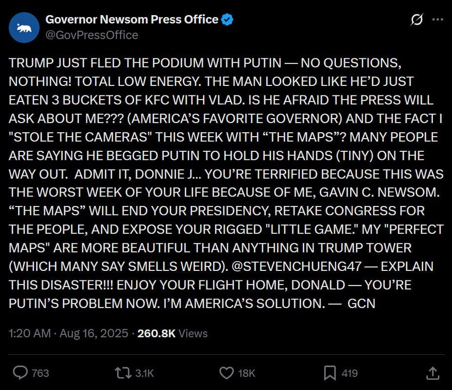 Văn phòng Báo chí Thống đốc Newsom govpressoffice ... Trump vừa rời khỏi bục phát biểu cùng Putin - không một câu hỏi, không gì cả! Năng lượng hoàn toàn suy sụp. Trông ông ta như vừa ăn 3 xô KFC với Vlad. Ông ta sợ báo chí sẽ hỏi về tôi sao??? (Thống đốc được yêu thích nhất nước Mỹ) và chuyện tôi đã "chôm máy quay" tuần này với "Bản đồ bầu cử"? Nhiều người nói ông ta đã cầu xin Putin nắm tay (nhỏ xíu) khi ra về. Thừa nhận đi, Donnie J... ông sợ hãi vì đây là tuần tồi tệ nhất trong đời ông vì tôi, Gavin C. Newsom. "Bản đồ bầu cử" sẽ chấm dứt nhiệm kỳ tổng thống của ông, giành lại Quốc hội cho người dân, và vạch trần "trò chơi nhỏ" gian lận của ông. "Bản đồ hoàn hảo" của tôi đẹp hơn bất cứ thứ gì trong Tháp Trump (mà nhiều người nói là có mùi lạ). stevenchueng47 - hãy giải thích thảm họa này!!! Chúc ông bay về nhà vui vẻ, Donald - giờ ông là vấn đề của Putin. Tôi là giải pháp của nước Mỹ.