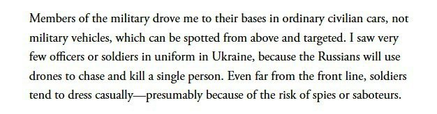 Quân đnhân uca đưa tôi đến căn cứ của họ bằng xe dân sự thông thường, chứ không phải xe quân sự dễ bị phát hiện từ trên cao và bị bắn. Ở Ukraine, tôi thấy rất ít sĩ quan và binh lính mặc quân phục vì Nga sử dụng máy bay không người lái để theo dõi và tiêu diệt một người. Ngay cả khi ở xa tiền tuyến, binh lính thường ăn mặc giản dị.