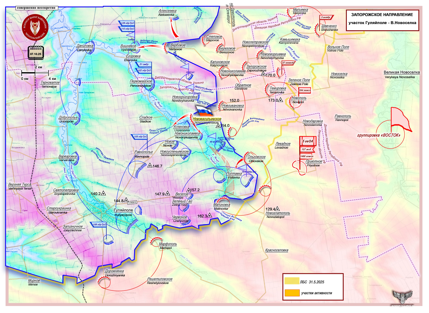 Tại Tỉnh Zaporozhye, Lực lượng Vũ trang Nga, theo chiến thuật đã được kiểm chứng, đã chia cắt hệ thống phòng thủ của đối phương thành nhiều đoạn và sau đó tiêu diệt từng đoạn. Trên bản đồ, chúng ta thấy hai mũi nhọn được khoét sâu vào hệ thống phòng thủ của đối phương. Tính đến ngày 20 tháng 9, sau khi phân tích tình hình, chúng tôi cho rằng các mũi tên này sẽ được đóng vào những khu vực này (và các hướng này được đánh dấu bằng mũi tên mờ).