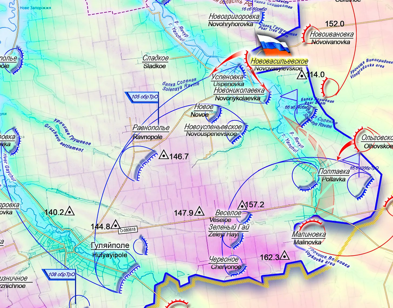 Theo logic của các sự kiện, hoạt động dự kiến sẽ diễn ra ở phía nam, Malinovka-Poltavka-Novonikolaevka (mũi tên mờ), nơi một mũi tên khác sẽ được đóng vào, sau đó chúng sẽ mở rộng và phá hủy khu vực bố trí của Lực lượng Vũ trang Ukraine ở bờ phải sông Yanchul.