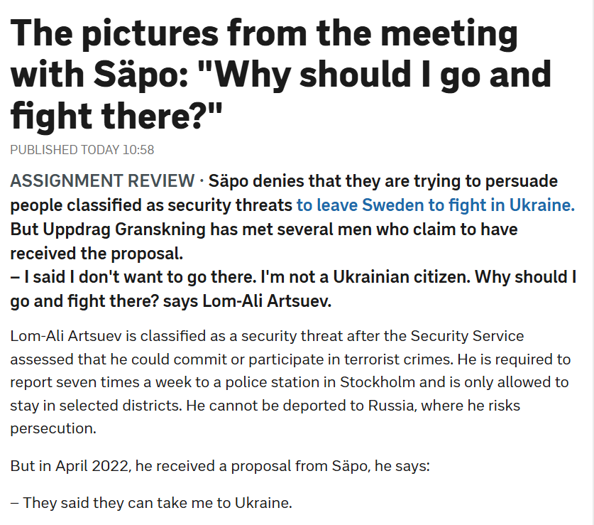 Anh ta đã ở Ukraine từ tháng 6 năm 2023. Anh ta tuyên bố rằng Säpo đã gây áp lực cho anh ta, và họ đã có một cuộc gặp riêng với vợ cũ của anh ta, người được yêu cầu thúc giục Gaziev rời đi.