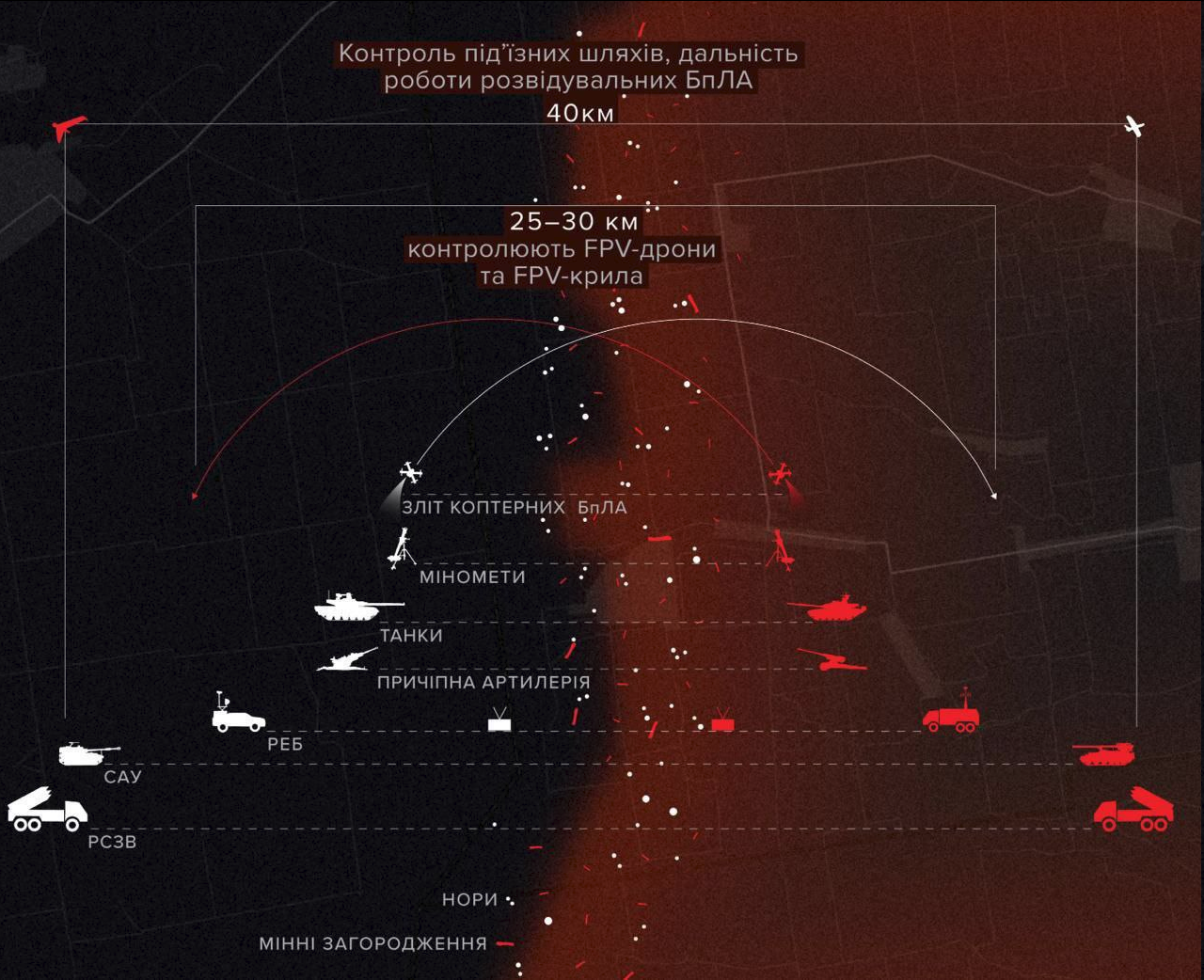 Bộ binh địch sống trong những hầm trú ẩn nhỏ hẹp chỉ 2- 4 mét vuông, bởi vì mối đe dọa chính với chúng chủ yếu đến từ phía trên: nếu chúng thò đầu ra, một chiếc dù hoặc camera FPV của ta sẽ xuất hiện. Chiến thuật này với chúng ta có khi được gọi là "chiến tranh bò trườn". Những người lính Nga đi bộ và bò, đôi khi bằng xe máy hoặc xe buggy. Xe thiết giáp hạng nặng hiếm khi xuất hiện và chúng chỉ xuát hiện trong thời gian vài phút trong "khu vực tiêu diệt" để kết thúc. Công tác hậu cần của cả hai bên thì được xử lý theo từng đợt nhỏ và bằng máy bay không người lái; Ban ngày, việc di chuyển gần như không có, việc ấy chỉ diễn ra vào lúc chạng vạng và trong điều kiện thời tiết xấu và luân phiên kiểu thả xe, sau đó đi bộ, mang theo 20-40 kg.
