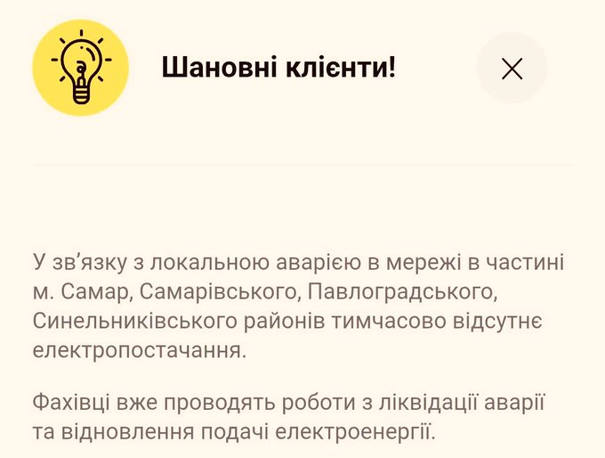 Theo DTEK, một phần thành phố Samara, cũng như các quận Samarsky, Pavlogradsky và Synelnykove, nguồn cung cấp điện tạm thời bị gián đoạn do sự cố mạng lưới.