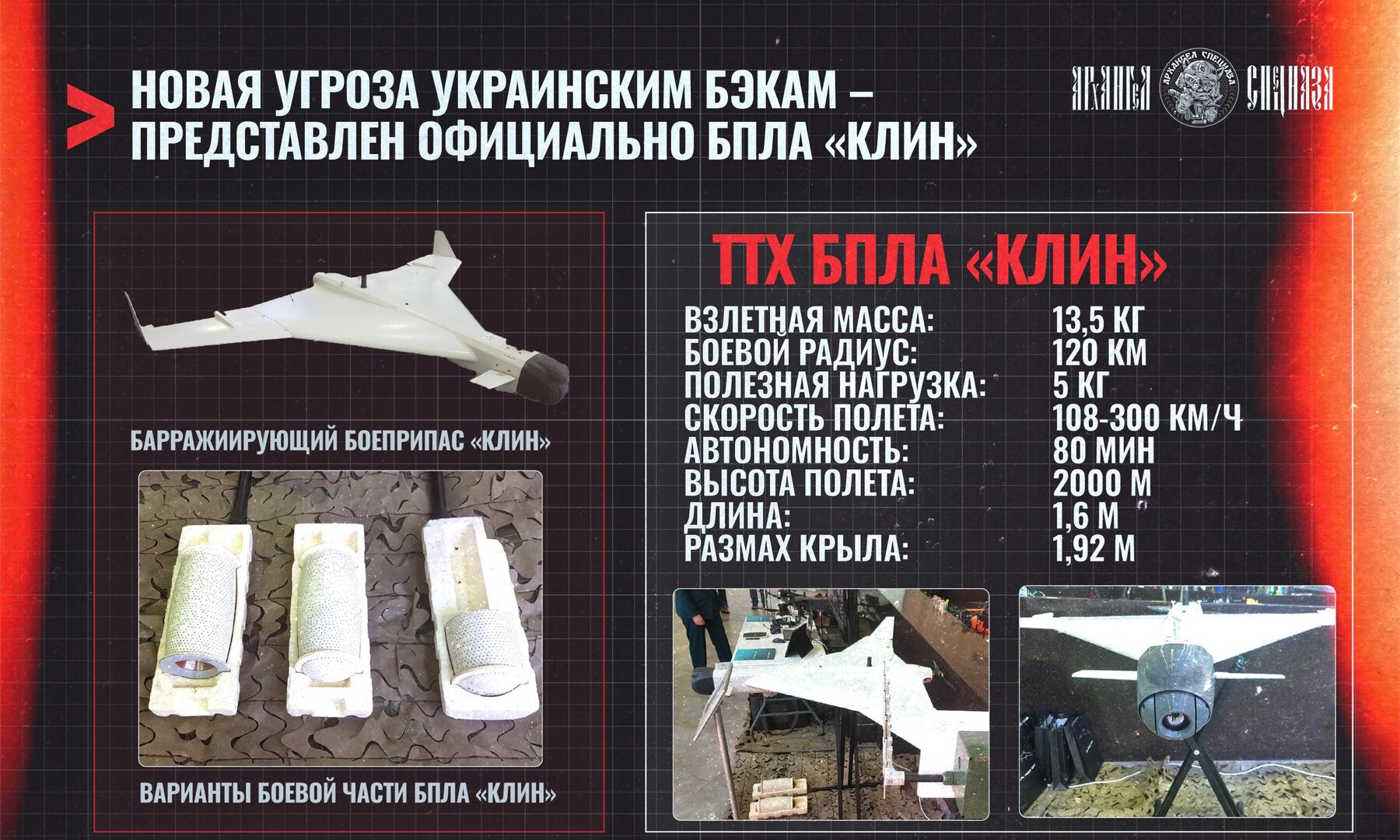 Một máy bay không người lái cảm tử (kamikaze) mới của Nga, "Klin", đã chính thức được ra mắt tại một triển lãm vũ khí. Nó được trang bị hệ thống tự động xác định mục tiêu và chức năng kích nổ đầu đạn không đối không.