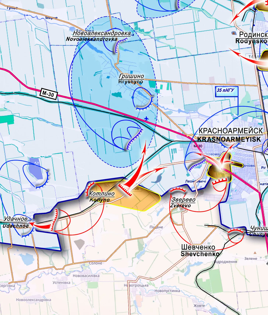 Ở khu vực phía tây nam, từ tuyến Kotlino, dọc theo tuyến đường sắt, các nhóm tấn công của Nga đang tiến về vùng ngoại ô phía tây Krasnoarmeysk và đến khu vực phòng thủ của Lực lượng Vũ trang Ukraine tại Novoaleksandrovka-Grishino (Hryshyno). Những hành động này đang kìm kẹp các đơn vị Ukraine tại các khu vực này, và nếu thành công, sẽ hình thành một vòng vây Krasnoarmeysk từ phía tây, chặn đường tiếp tế dọc theo đường cao tốc M-30.