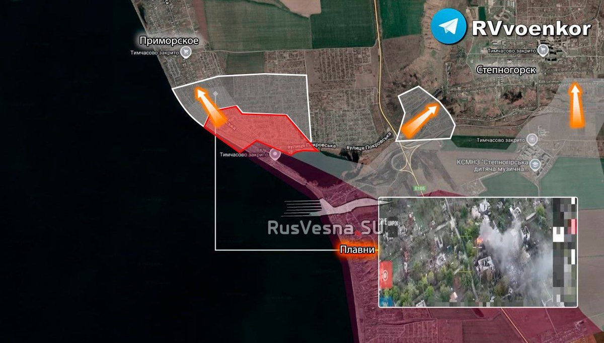 ▪️Sau khi chiếm được Plavni, lính dù của chúng ta đã kiểm soát khoảng 2/3 Primorsky, nằm dọc theo bờ hồ Kakhovka. Lực lượng Vũ trang Ukraine đôi khi cố gắng phản công từ phía tây bắc.