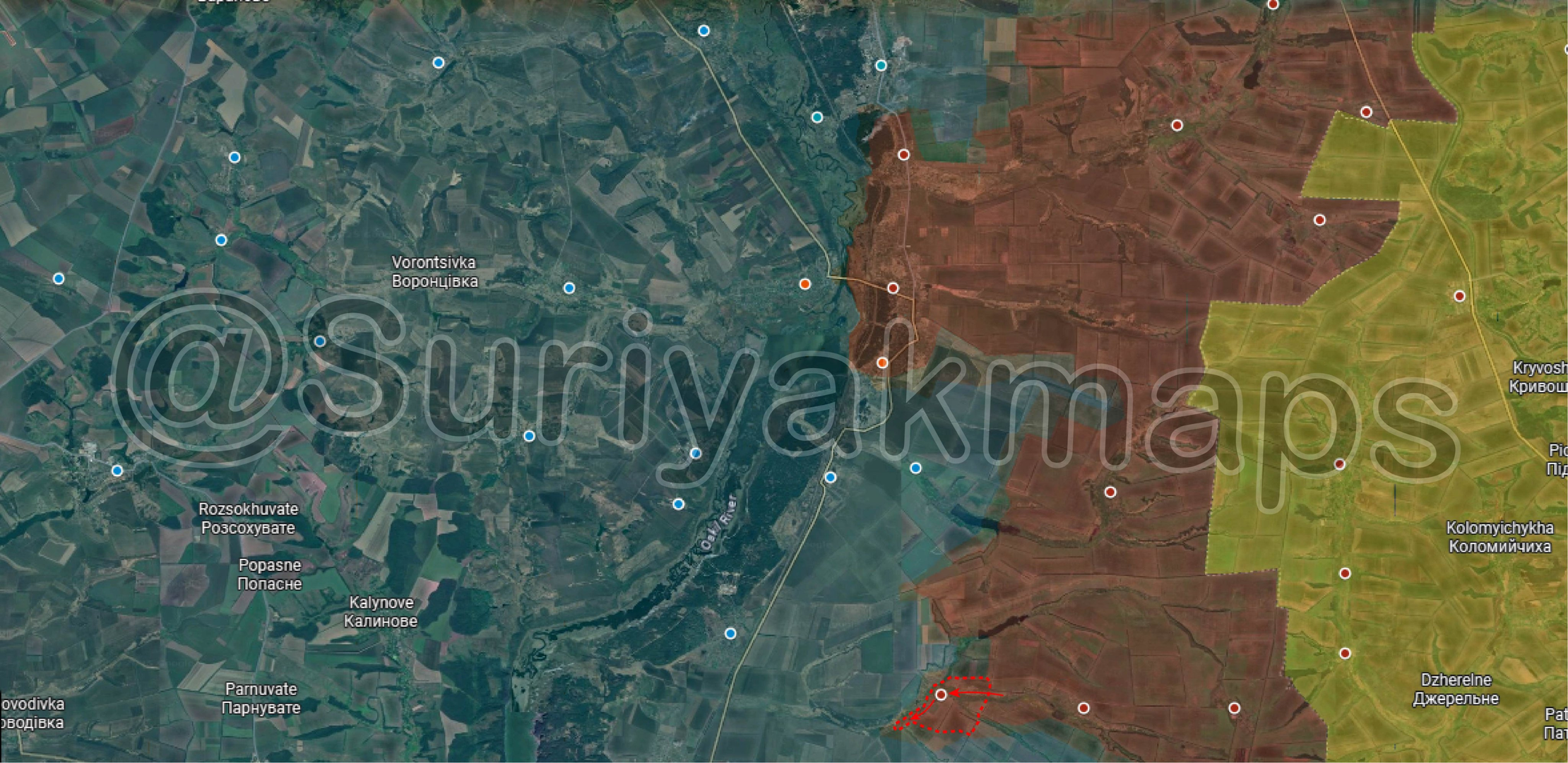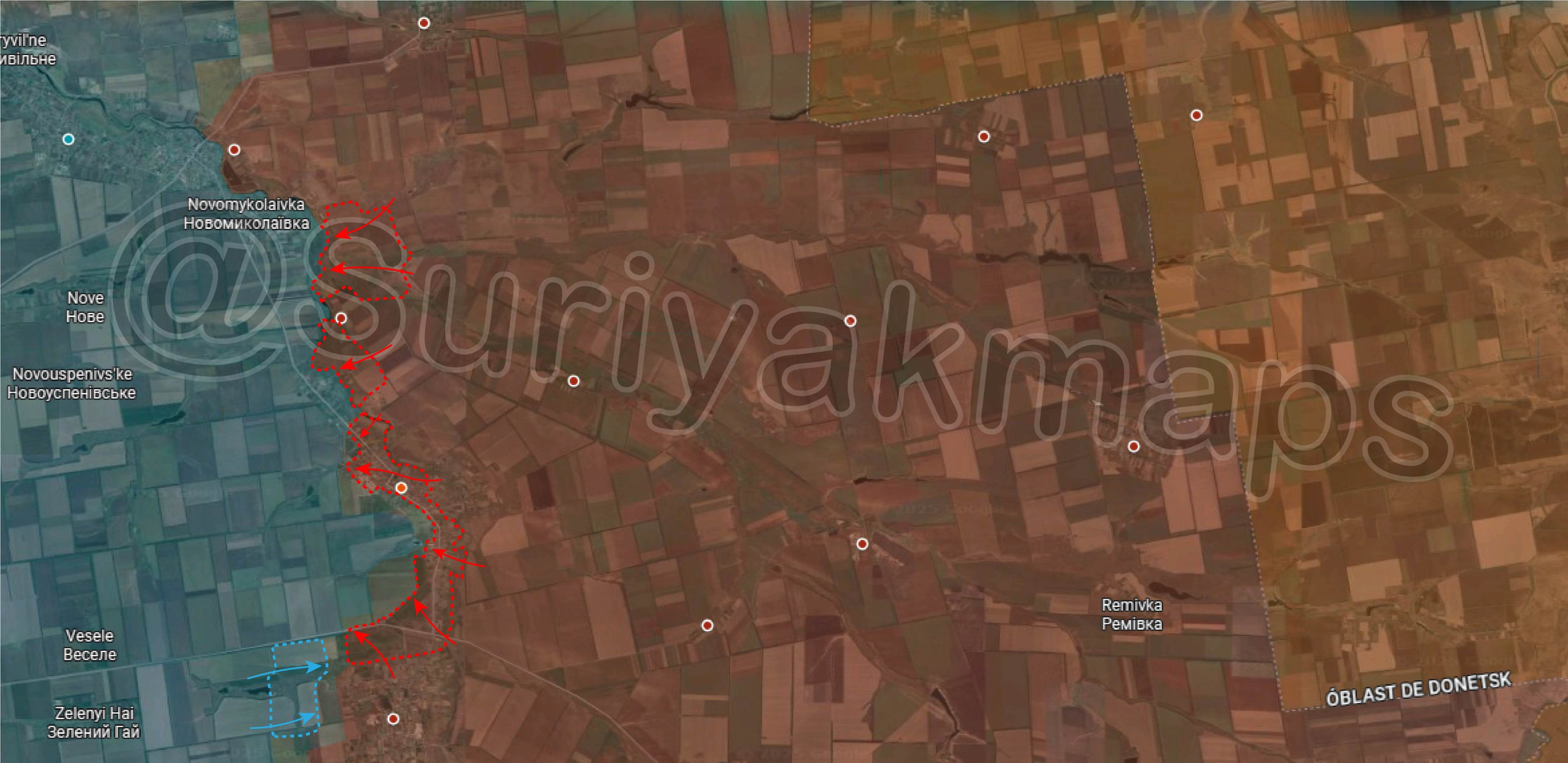 Tình hình mặt trận Velikomikhailovskaya: Đồng thời với cuộc tấn công vào Oleksiivka, Quân đội Nga bắt đầu tiến về phía nam Verbove, bọc sườn tuyến phòng thủ đầu tiên của #Quân đội Ukraine và kiểm soát địa bàn Pryvillya, từ đó tiến đến sông Yanchur.