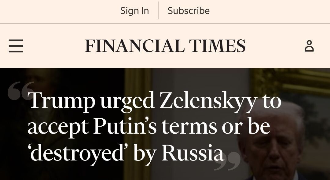 Trump thúc giục Zelensky chấp nhận các điều khoản của Putin hoặc sẽ bị Nga "hủy diệt". — FT