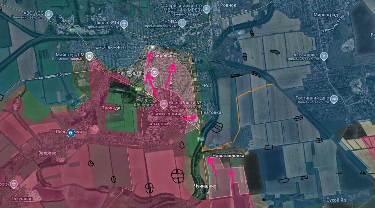 Về phía tây, quân đội Nga đã có thể bảo vệ và củng cố phần còn lại của Quận Durniak, trước khi tiến về phía đông qua Quận Pervomaika phía bắc và vào trung tâm thành phố, nơi giao tranh vẫn đang diễn ra. Họ cũng chiếm được các khu vực phía tây Quận Durniak và mở rộng vùng xám hơn nữa trong khu công nghiệp phía tây bắc Pokrovsk.