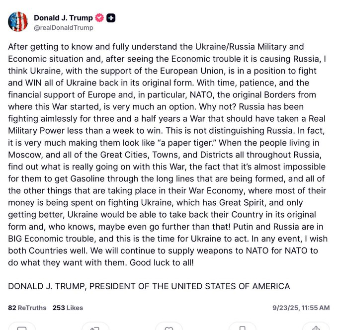 Trump đúng miệng con buôn, ngày 23/09/2025 hắn còn gọi Nga hổ giấy