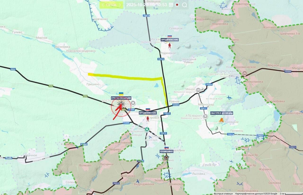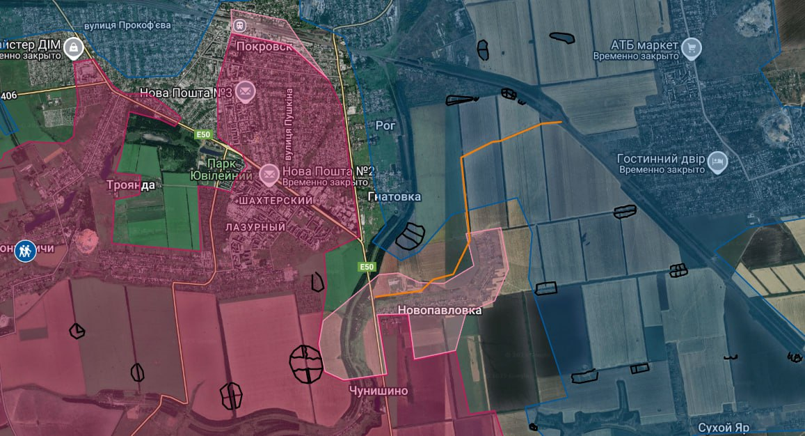 Tuyến đường được đánh dấu màu vàng trên bản đồ là tuyến đường duy nhất còn lại để Lực lượng Vũ trang Ukraine di chuyển trong khu vực Pokrovsk. Con đường này dễ bị tấn công và đang được các máy bay không người lái Nga kiểm soát hỏa lực hoàn toàn. Hiện tại, cấu hình tác chiến của mặt trận ở khu vực Pokrovsk và Myrnohrad khiến cả hai thành phố này bị bao vây, và cách duy nhất để Lực lượng Vũ trang Ukraine bằng cách nào đó tác động đến điều này là tung toàn bộ lực lượng dự bị còn lại vào trận chiến, sau khi đã rút họ khỏi mọi đầu mặt trận. Mọi kịch bản khác đều không hiệu quả và khó có thể mang lại kết quả.