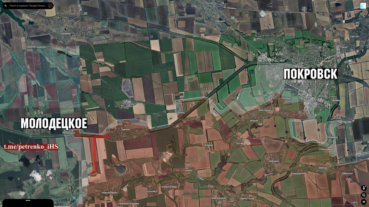 Phía Tây Pokrovsk, quân đội Nga đã quay phim các cuộc biểu tình cờ tại khu định cư Molodetske và tuyên bố chiếm được nơi này. Có nhiều báo cáo về giao tranh ở vùng ngoại ô phía Tây Molodetske.