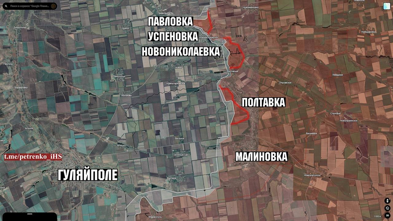 Phía tây Poltavka, quân địch đã tiến dọc theo vành đai rừng và tiếp tục tiến về phía tây. Với tình hình và xu hướng hiện tại của mặt trận, quân đội Nga sẽ gia tăng áp lực lên Uspenivka và tiếp tục tiến về thành phố Huliaipole."