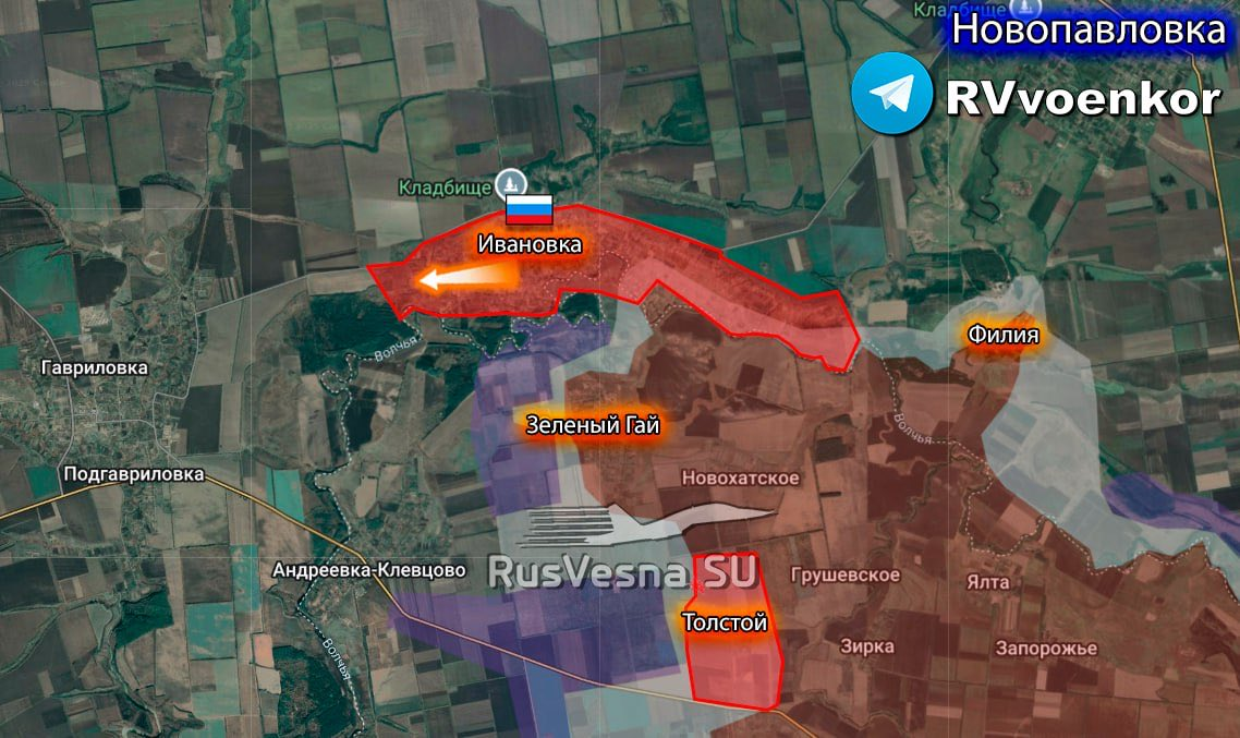 Quân đội Nga đã có thể tiến vào Novopavlovka từ phía nam nhờ Quân đội Ukraine mất quyền kiểm soát Ivanovka lân cận. Quân đội Ukraine đã tái triển khai lực lượng từ bờ đông sông Solenaya, lo ngại rằng quân đội của chúng ta sẽ đánh vào sườn một khu vực phòng thủ quan trọng. Đồng thời, họ đang cố gắng củng cố các vị trí ở phía bắc Ivanovka để ngăn Novopavlovka bị bao vây.