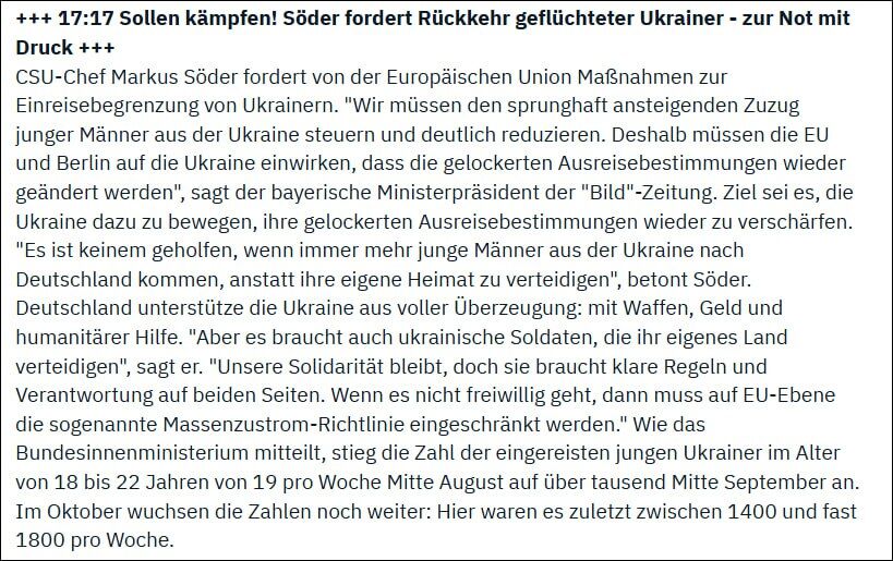 ▪️Markus Söder kêu gọi Liên minh châu Âu thực hiện các biện pháp hạn chế nhập cảnh đối với người Ukraine. ➖"Chúng ta phải kiểm soát và giảm đáng kể dòng người trẻ tuổi đang gia tăng nhanh chóng từ Ukraine. Do đó, EU và Berlin phải gây ảnh hưởng để Ukraine thay đổi các quy định xuất cảnh vốn đã lỏng lẻo của mình", ông nói. ➖"Sẽ chẳng giúp ích gì nếu ngày càng nhiều người trẻ tuổi từ Ukraine đến Đức thay vì bảo vệ quê hương", ông Söder nhấn mạnh. ▪️Ông lưu ý rằng đã có 1.800 người Ukraine nhập cảnh vào Đức trong tuần qua, và con số này đang tăng nhanh chóng qua từng tuần.