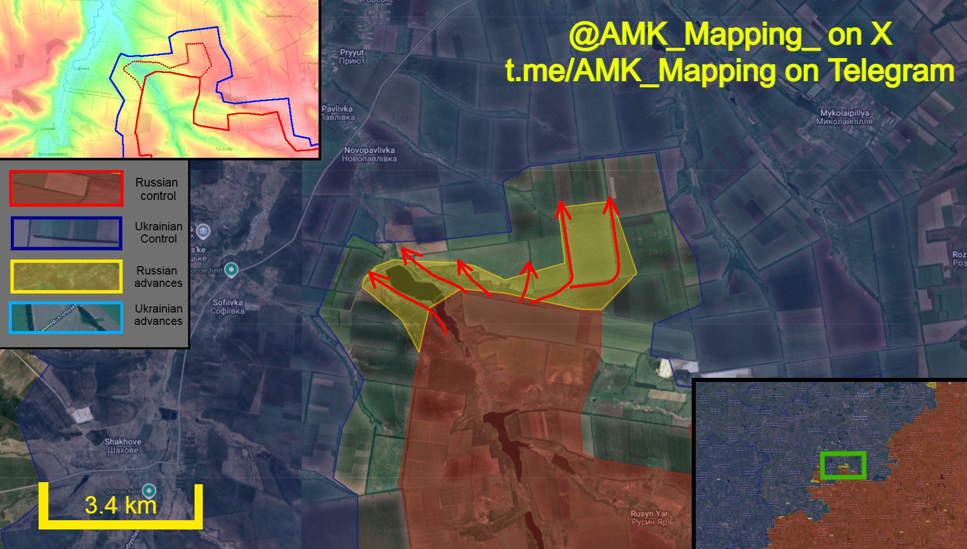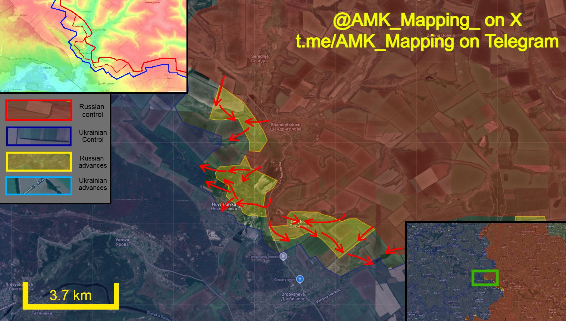Về phía nam, sau khi củng cố lực lượng trong khu phức hợp nông nghiệp, quân đội Nga đã tiến vào khu rừng phía bắc Novoselivka và bắt đầu tấn công về phía tây hướng tới khu rừng rộng lớn hơn. Các lực lượng khác tiến qua sông Nitrius và giành quyền kiểm soát toàn bộ khu vực phía bắc Novoselivka. Các nhóm tấn công này bắt đầu tiến về phía bắc đến khu rừng đầu tiên, đẩy quân Ukraine ra khỏi vị trí của họ ở bờ tây của hồ chứa nước lớn. Từ đó, họ bắt đầu tiến xa hơn về phía tây qua các khu rừng, với các cuộc tấn công bằng máy bay không người lái FPV (FPV) trên diện rộng nhắm vào các vị trí, tuyến đường tiếp tế và các điểm phân phối của quân Ukraine ở phía trước. Xa hơn về phía nam, các hoạt động tấn công bắt đầu hướng về trung tâm Novoselivka, nơi vùng xám đã mở rộng.